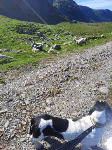 Minä, Yoshi, en suosittele Lofoteja pennuille, lyhyt jalkaisille koirille enkä pienille ihmisille. Kalastajakyliä on, mutta yhtään kalastajaa saati tuoretta kalaa ei nähty. Yöpymispaikkoja ns. puskaparkkeja Lofoteilla on todella paljon, joskin on hankala löytää vapaata paikkaa, sen verran oli turisteja liikenteessä. Jotkut turisteista olivat myös hyvin törkeitä ja pysäköivät pokkana asukkaiden pihoille autojaan. Ei ihme, että paikalliset eivät niinkään innostu turistimääristä. Turistit tukkivat tietysti myöskin liikenteen maisemia ihmetellessään ja pysähdellessä milloin mihinkin kuvailemaan. Paikallisetn onneksi rakenteilla on uusi suorempi ja nopeampi tie halki vuoristojen. Siistiä saarella on. Kaikenkaikkiaan aika tylsä paikka näin kun ei voi vaellella korkeilla vuorilla. Meidän piti siis alunperin ajaa Lofootit alas ja takaisin ylös, mutta ei ollut meidän paikka, joten ajoimme Moskenesista lauttaan ja matkasimme mantereelle.