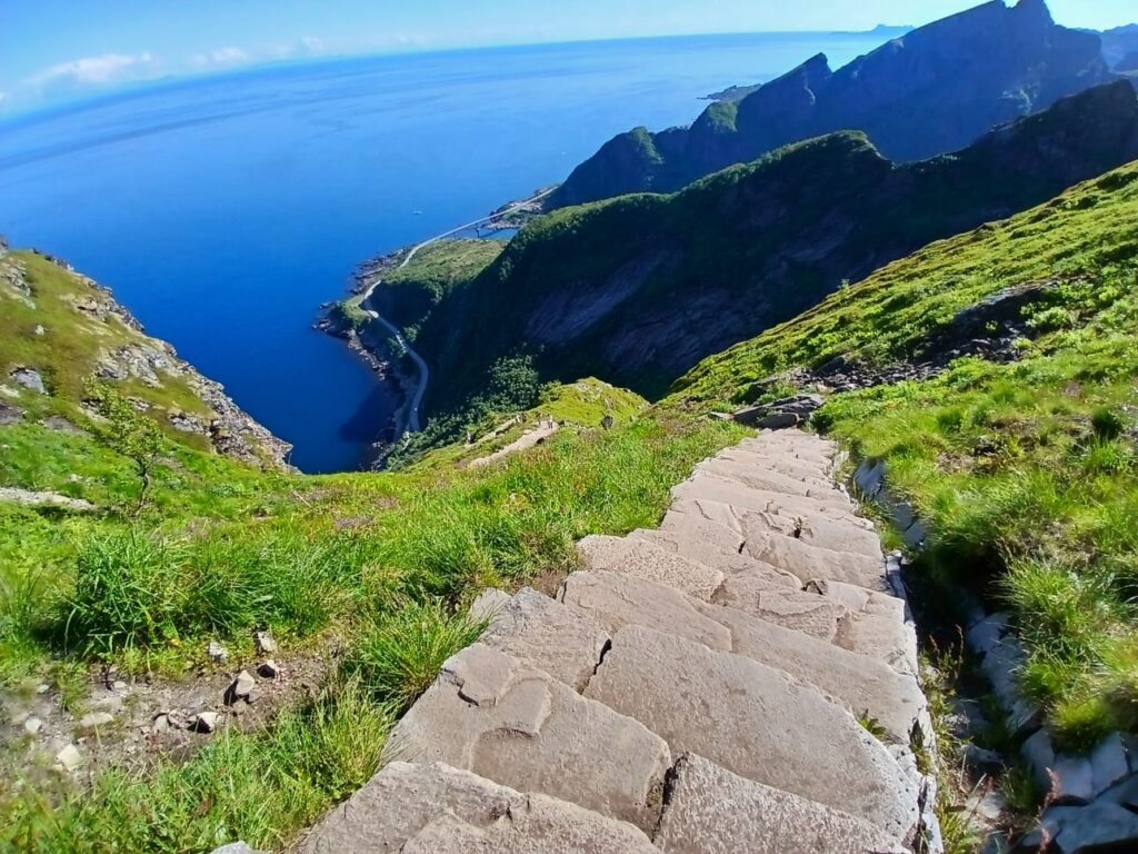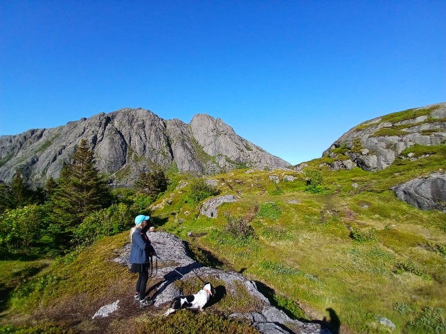 Ylhäällä vuorten välissä näin polun, jota pitkin ihmiset kiipesivät. Se vei kuulemma Reinebringenin huipulle, josta avautuu Lofoottien kuuluisin maisema. Äiti sanoi, että sinne nouseminen olisi liian jyrkkä retki pienelle bassetille. Käytti minua tekosyynä, itse ei uskalla kiivetä. Äitin tytär kiipesi ja valloitti huipun.