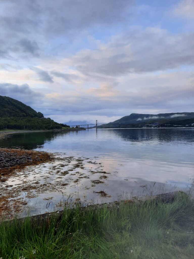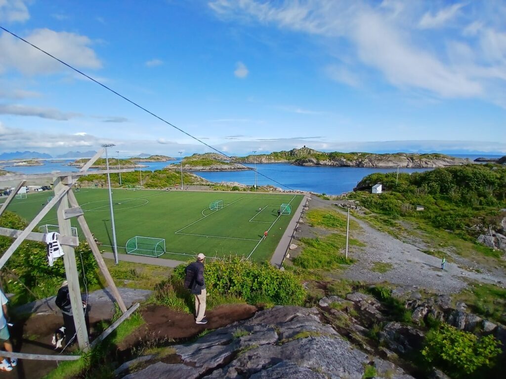 Sitten menimme sillalle, josta näkyi Henningsværin jalkapallokenttä. Se on kuuluisa, koska se on rakennettu pieneen kalliosaareen, aivan meren viereen. Äiti sanoi, että se on yksi maailman kauneimmista kentistä. Minusta se näytti ihan isolta vihreältä peitolta, jota meri halusi halata.